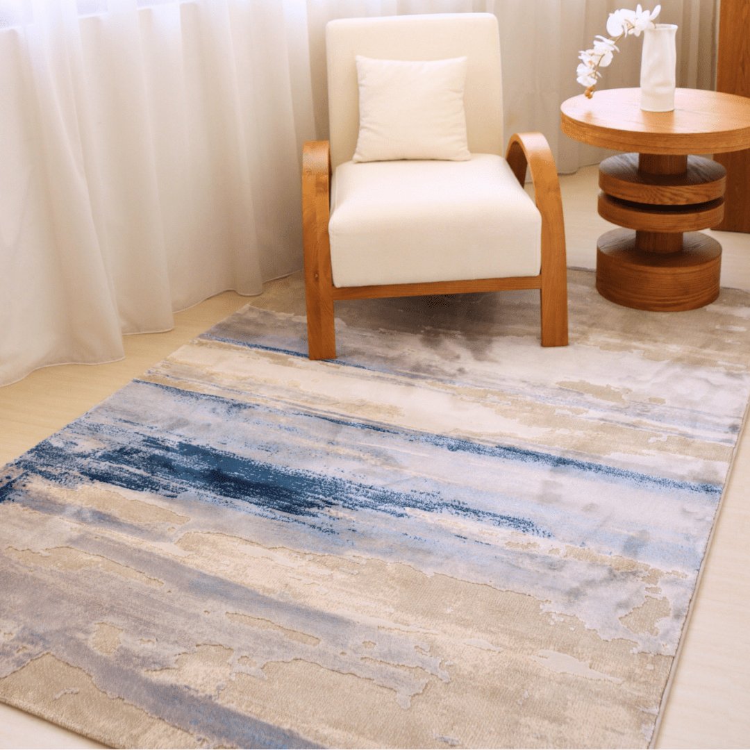 A person on a couch resting on a soft beige and blue patterned carpet, adding a cozy and elegant touch to the room.