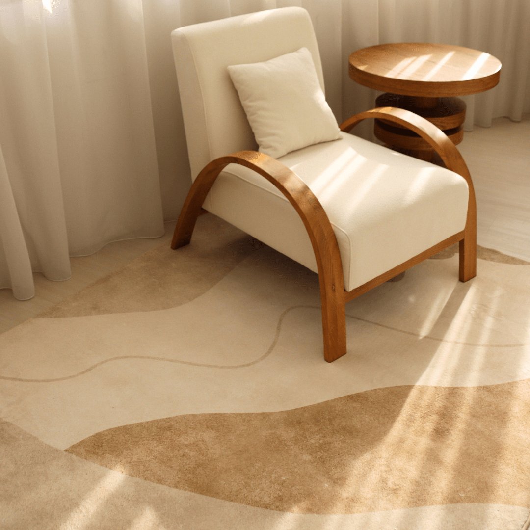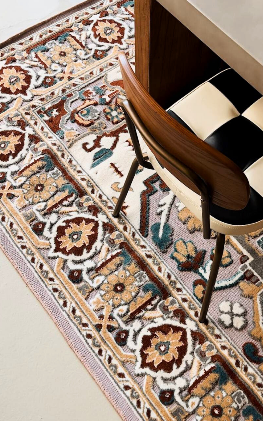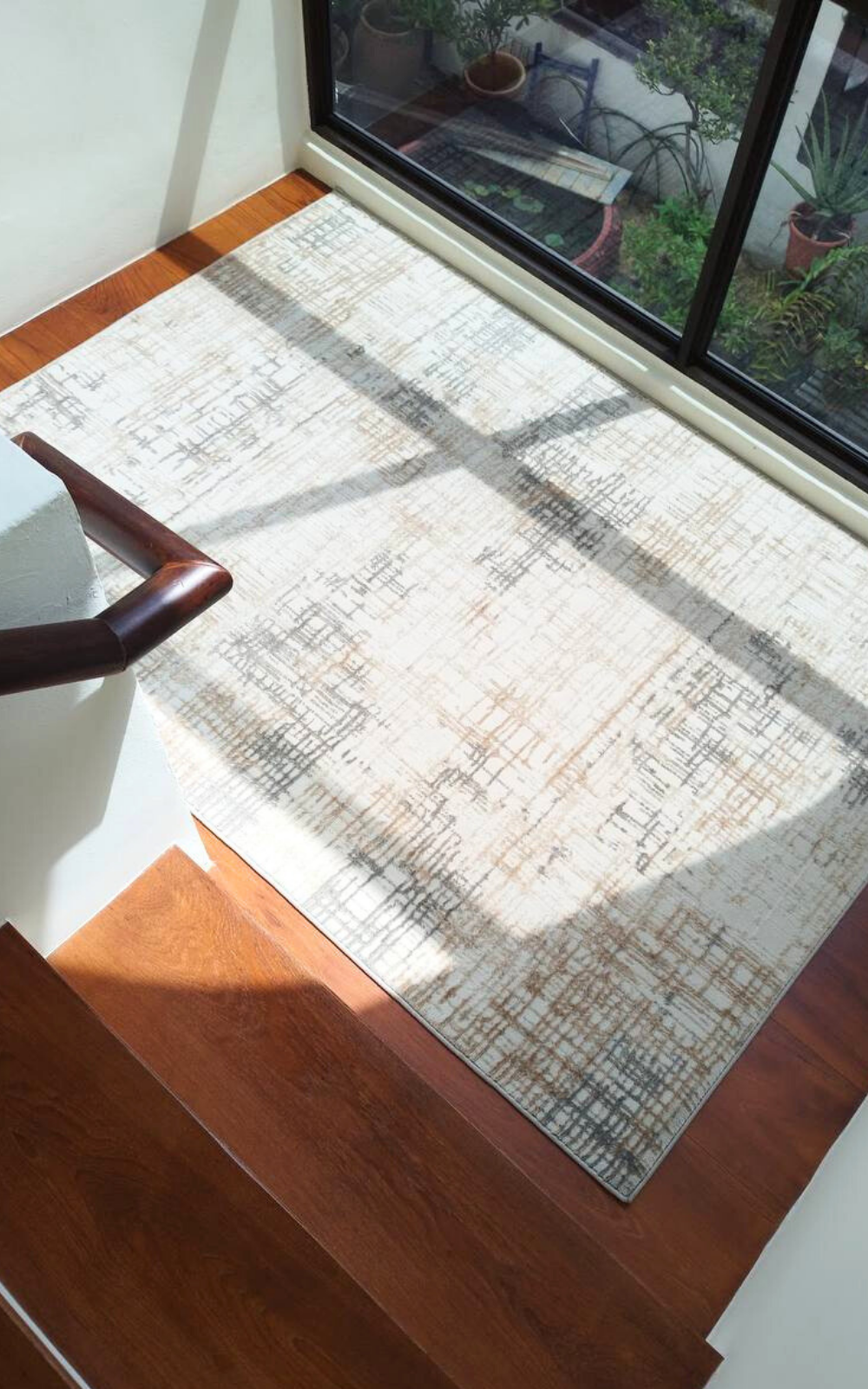 • A woman in a living room, on a cream-colored carpet with a soft, multicolored floral pattern, creating a warm atmosphere.