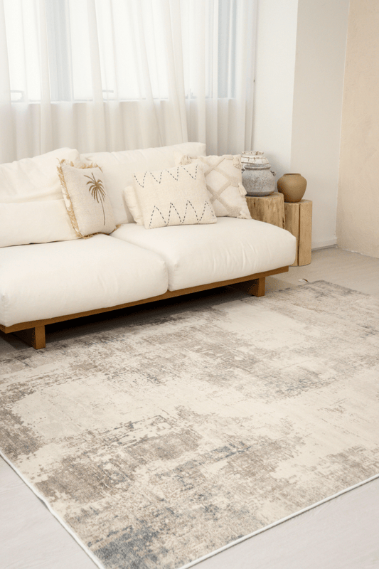 • A blue and beige abstract carpet with a textured design that blends soft tones, creating a modern aesthetic for any room.