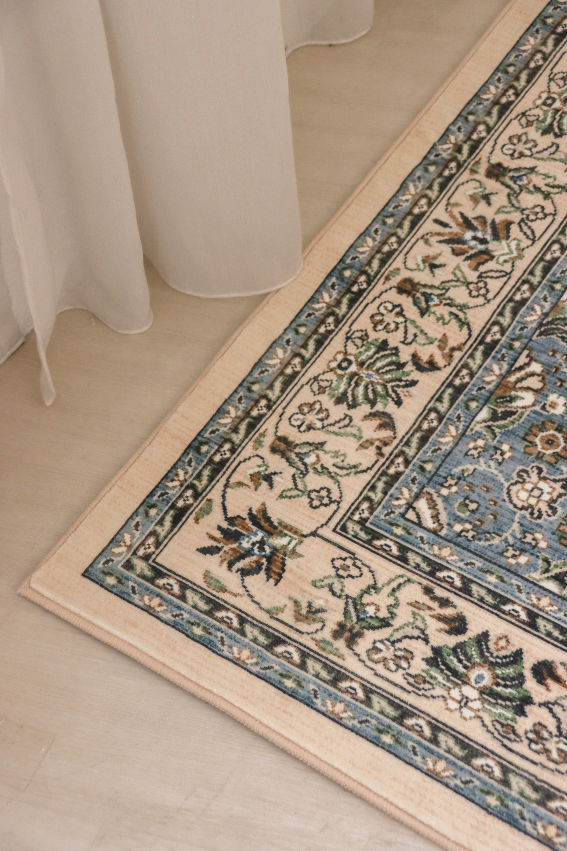 Blueveil Medallion features an elegant floral medallion design in soothing tones of powder blue, sage, and ivory, truly a refined statement piece for timeless interiors.