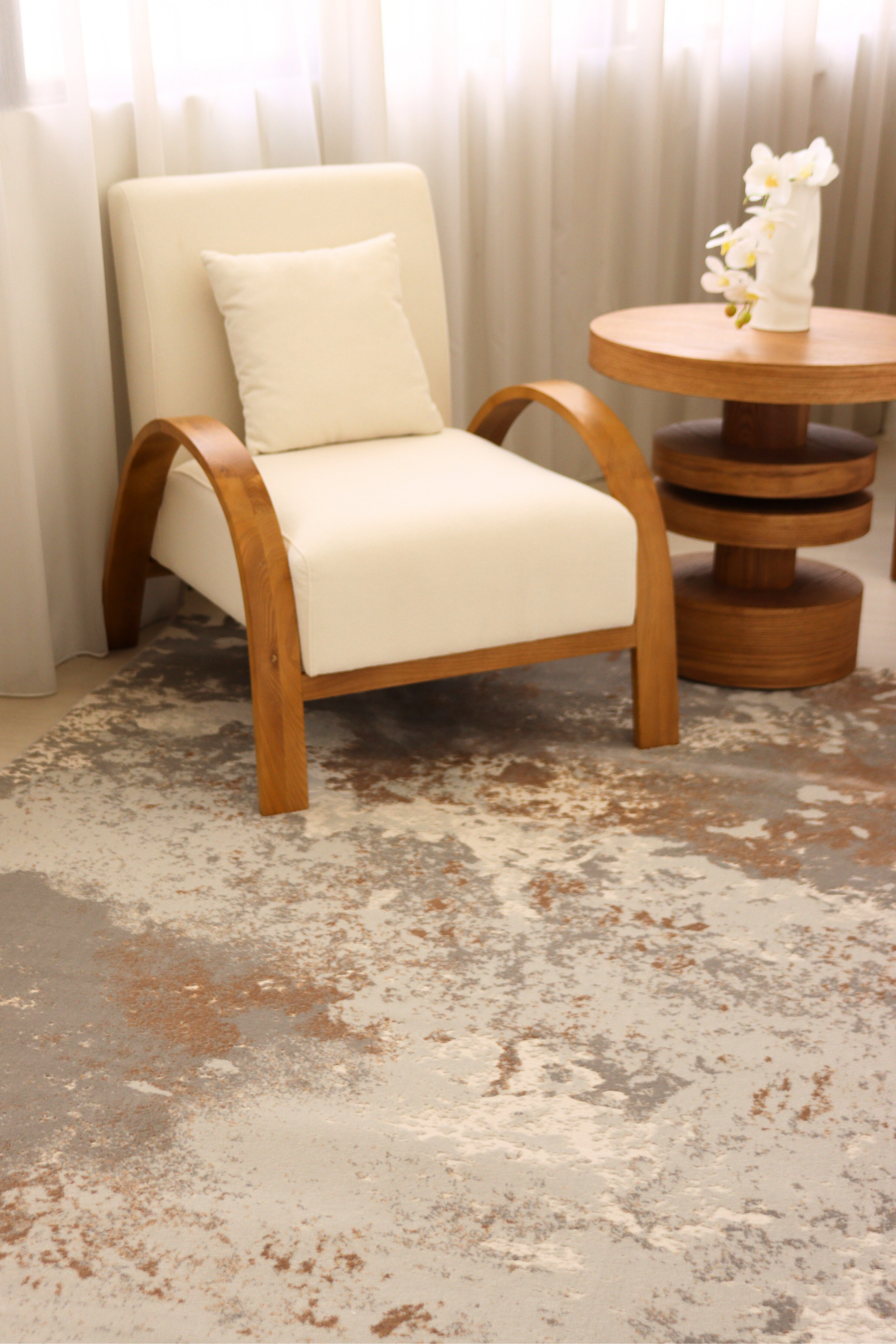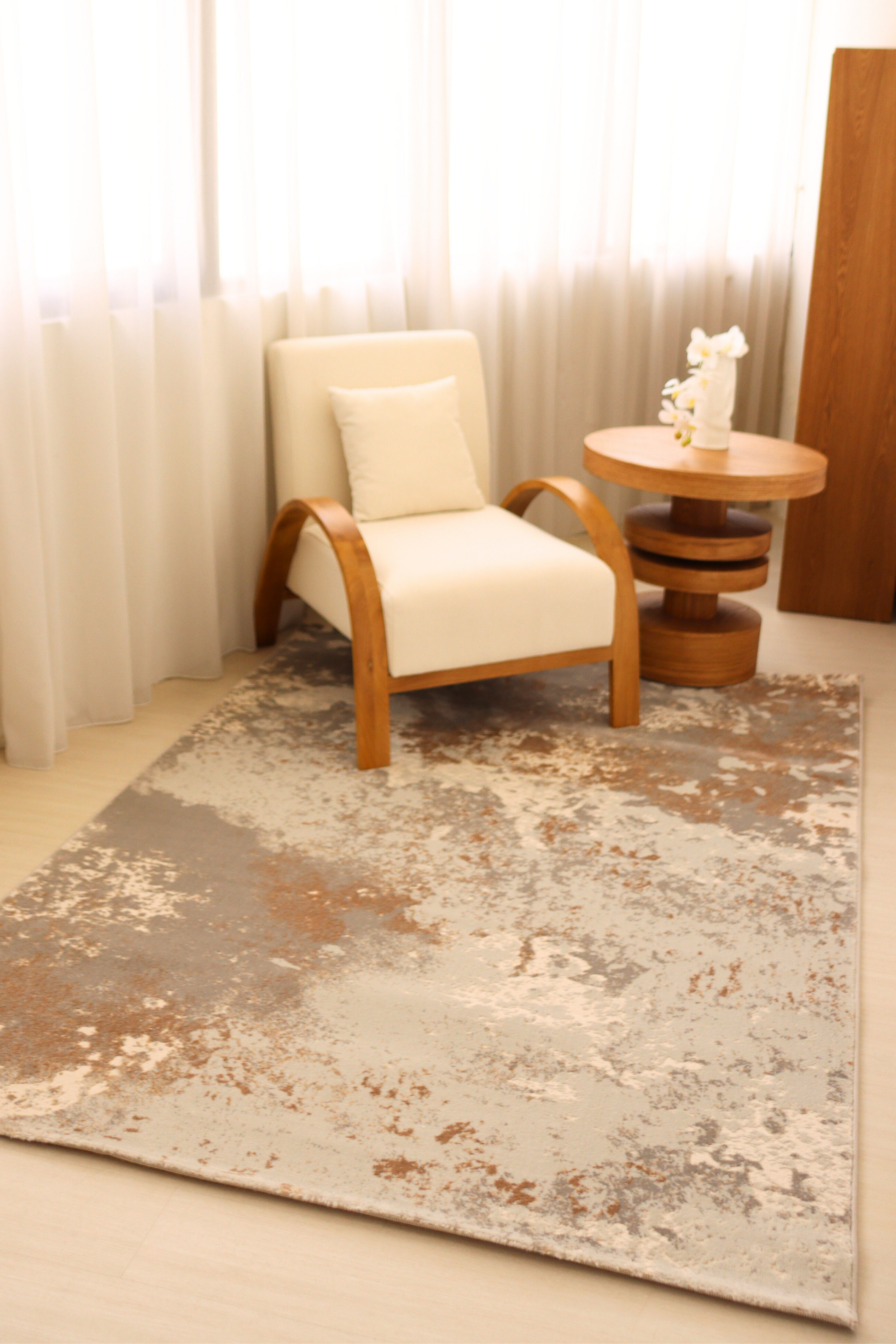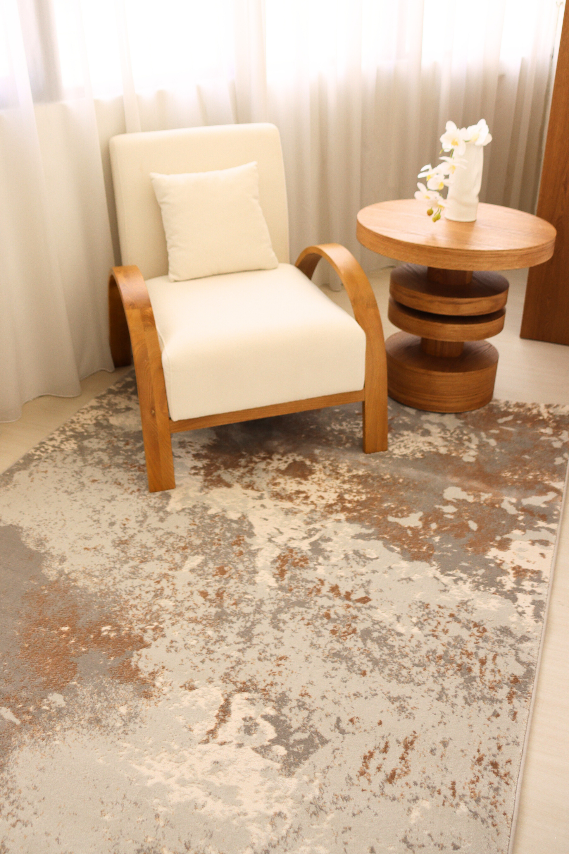 This luxurious carpet features an artful blend of soft dove grey, warm bronze, and creamy ivory tones, creating a stunning, weathered stone effect. Its elegant abstract design brings rich texture and depth, making it a captivating centerpiece for refined, contemporary spaces. The harmonious neutral palette elevates any interior with an effortless sense of warmth, sophistication, and understated grandeur.
