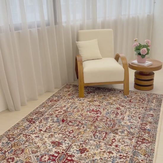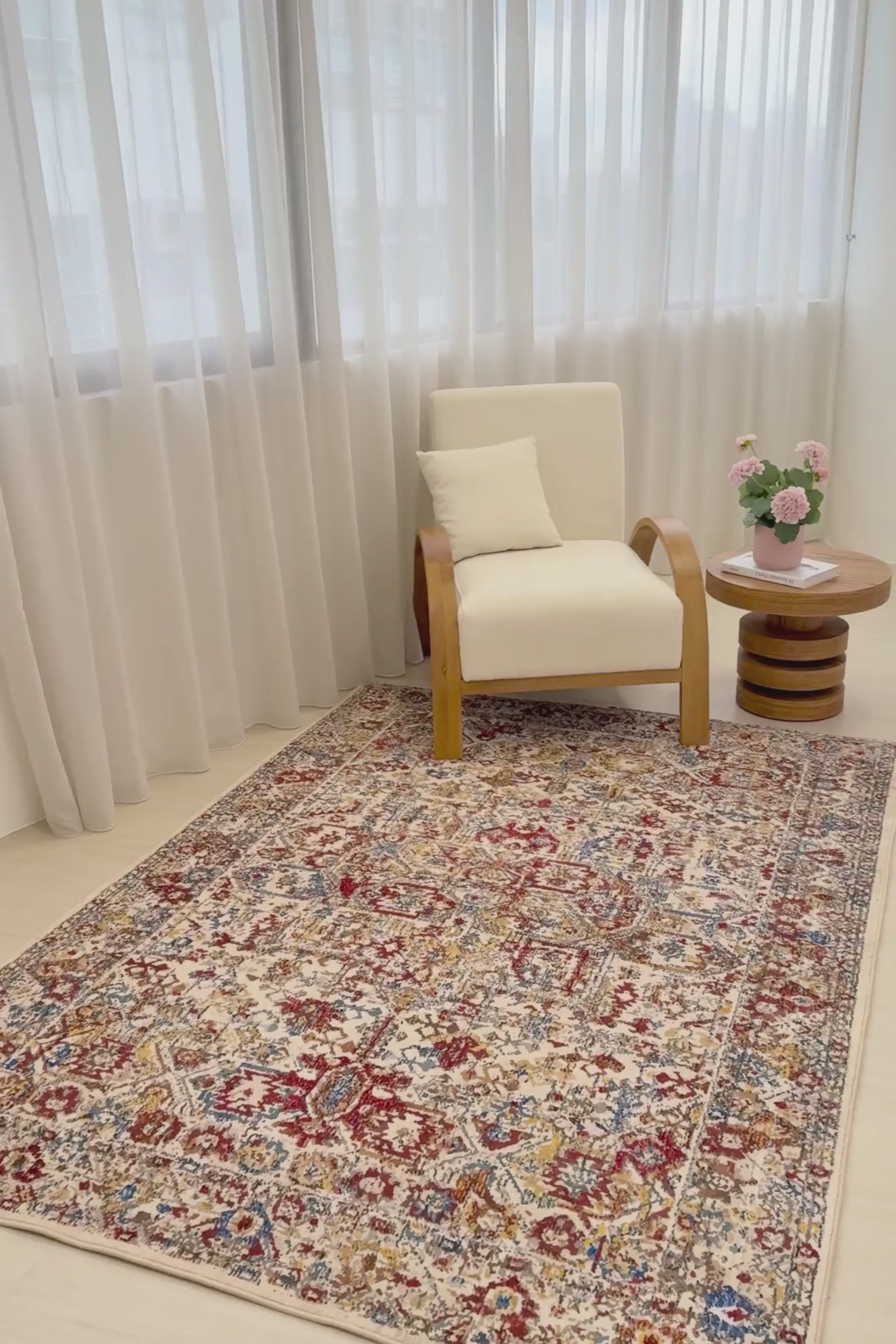Crimson Heritage features a rich blend of red, gold, and blue tribal motifs on a warm ivory base, exuding old-world charm with a modern distressed finish.