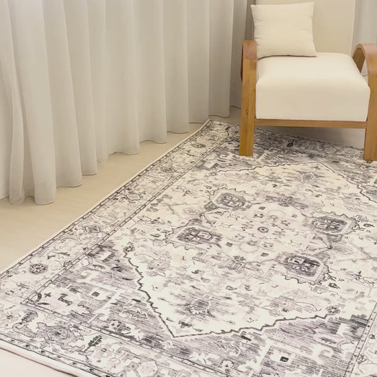Greystone Heritage features a distressed Persian medallion design in layered tones of grey and cream, creating a beautifully weathered and elegant look. A versatile neutral piece that brings quiet sophistication to any interior.