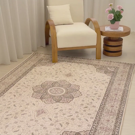 Ivory Palace features a grand floral medallion surrounded by delicate vine detailing in soft ivory, blush, and sage tones, creating a graceful and serene centrepiece. A refined design that brings gentle elegance to any interior.