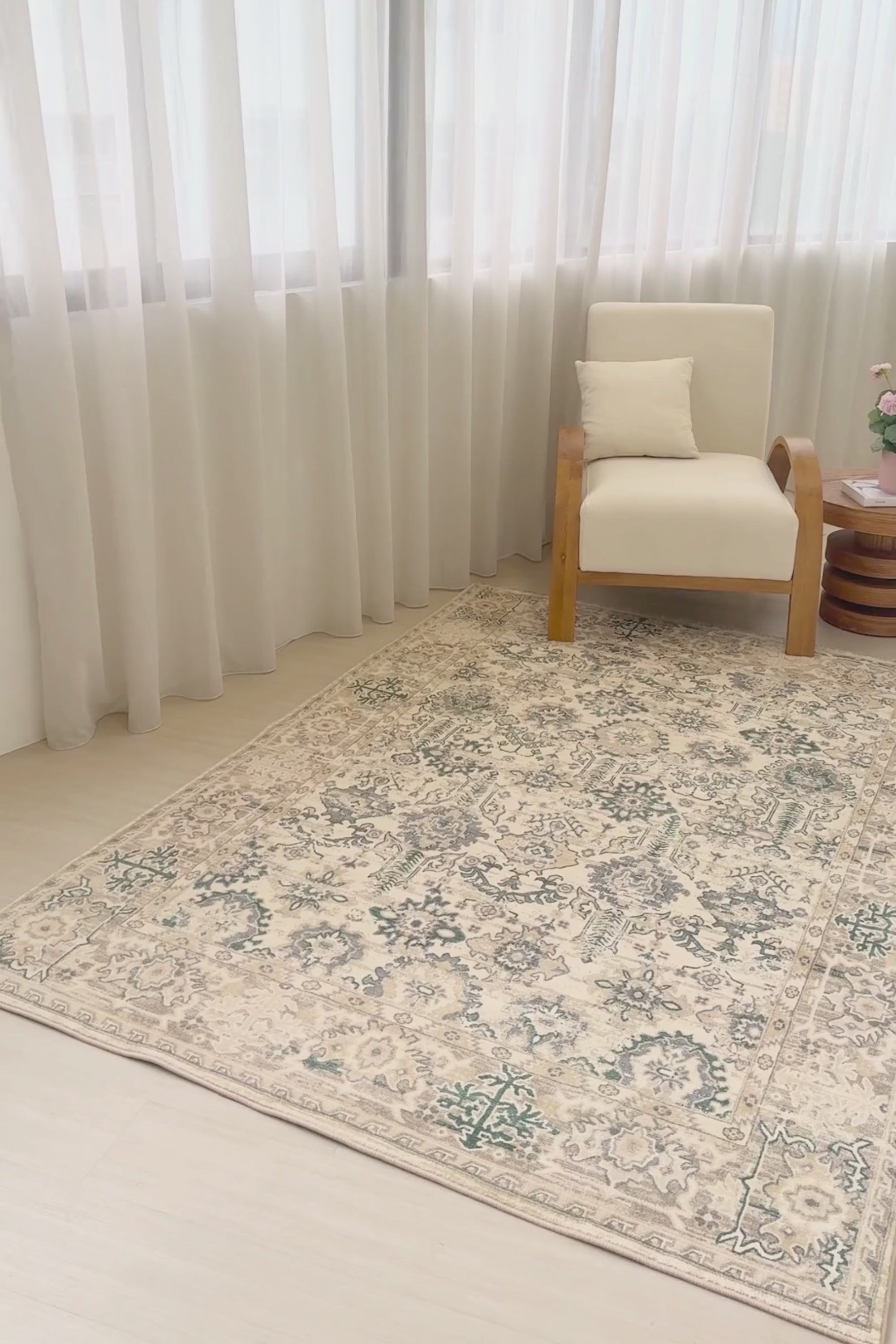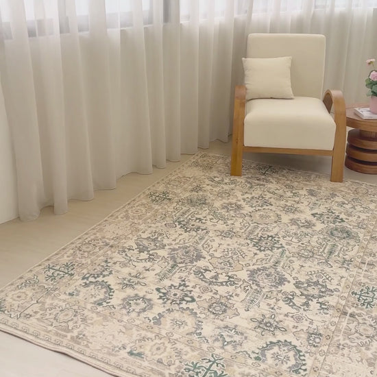 Sage Shiraz features a distressed Persian floral pattern in calming sage green, grey, and ivory tones, offering an airy and elegant vintage look. A soothing palette that blends beautifully with modern neutral interiors.